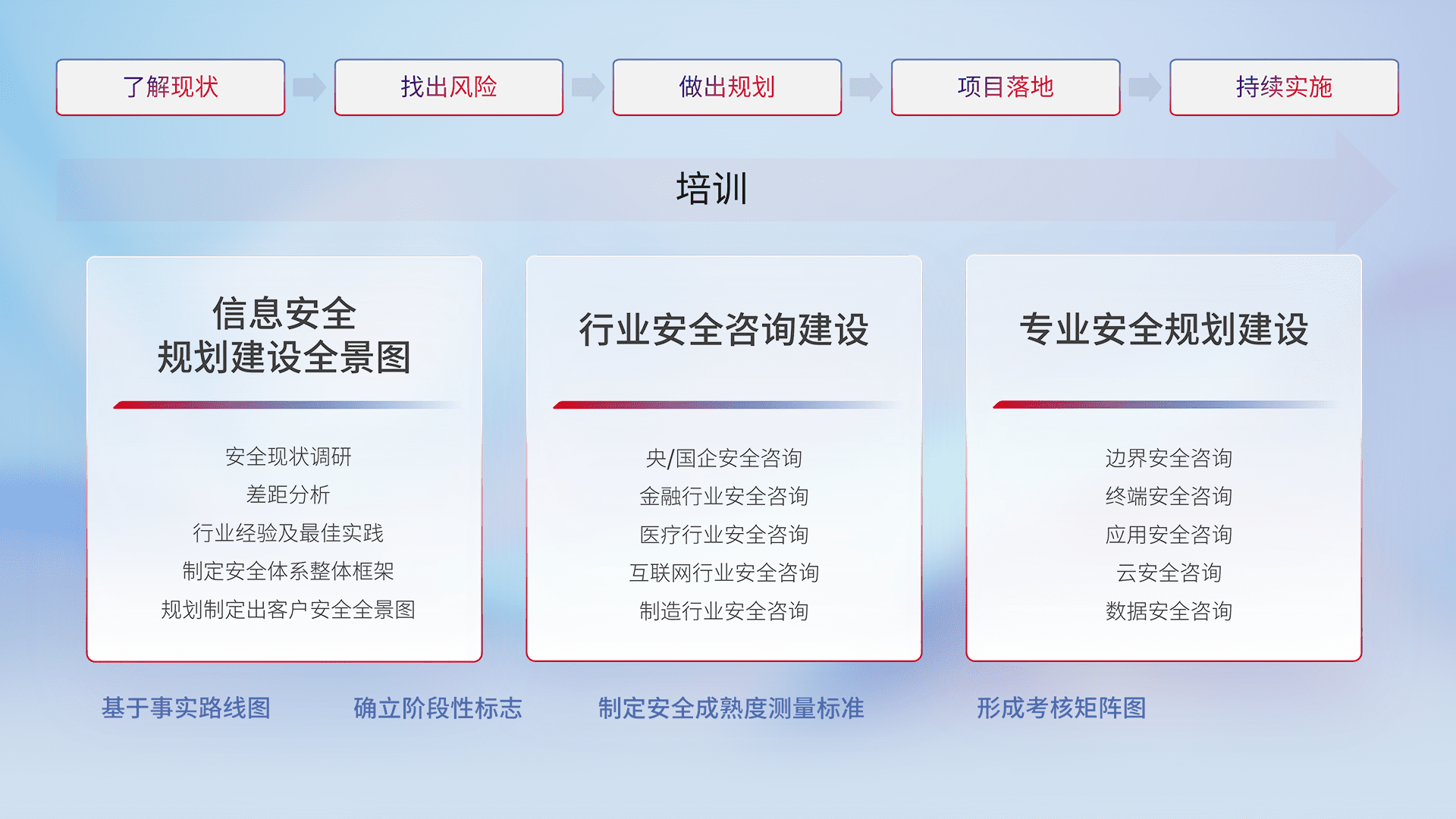 针对客户行业特性,,以专业的安全服务+多厂商联合解决方案提供专属的一站式安全管理服务,,帮助客户全面感知网络空间威胁,,,,基于识别、、检测、、、分析、、防护、、、监测、、、、响应的服务理论模型,,,,从方案咨询、、、集成交付、、评估验证、、、、优化加固、、、、运维运营,,致力于为客户提供完整的闭环管理式安全服务。。。以实战经验为客户打造高抵御风险的安全体系,,,帮助客户发现威胁、、、、对抗威胁、、、、处置威胁,,不断积累安全对抗能力,,,持续保障数字化安全。。。
